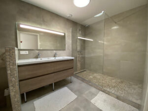 A l’étage : de trois chambres sans rampant et d’une grande salle de bain avec douche à l’italienne et double vasque, 2ème toilette