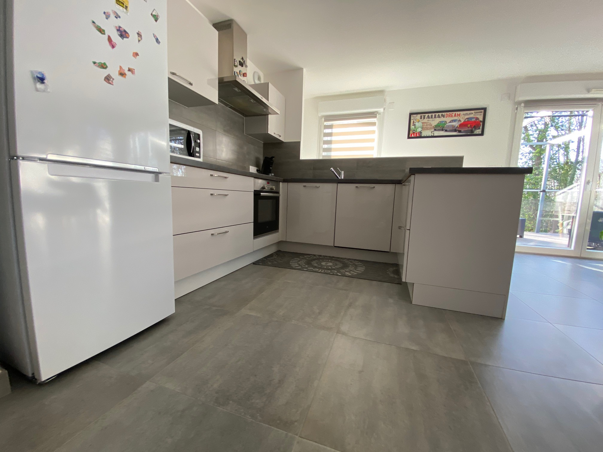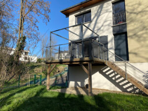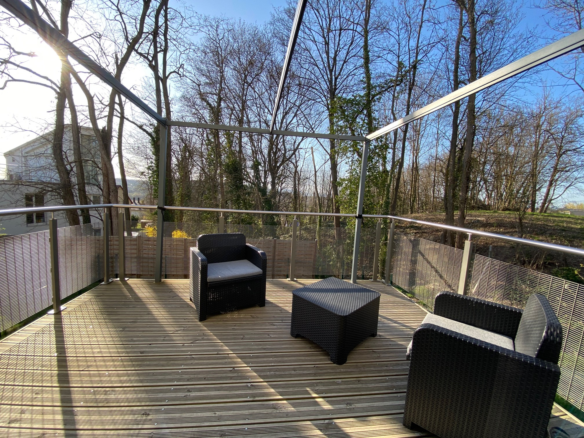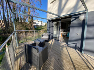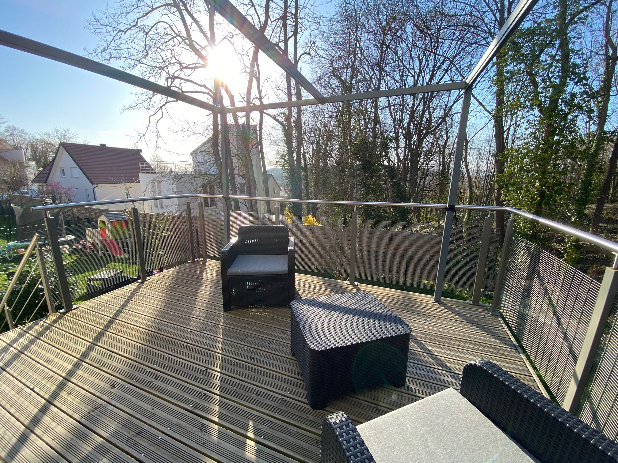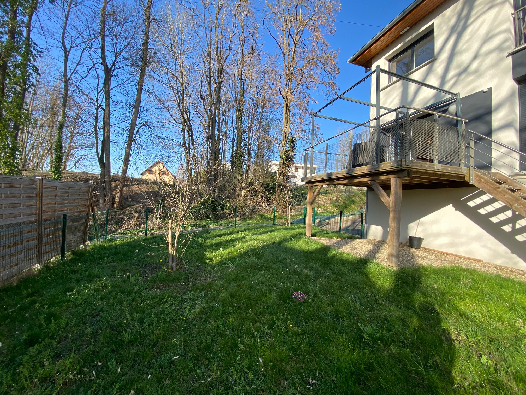 Sur les hauteurs de Brunstatt dans une situation idyllique très au calme en lisière de forêt, venez découvrir ce bel appartement de 4 pièces d’une superficie de 89 m2 habitables en duplex avec terrasse suspendu en bois et son jardin privatif de 1,05 ares