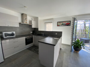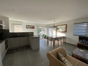 Il se compose d’une entrée avec placard intégré, d’un toilette, d’un spacieux et lumineux séjour avec vue dégagée baie vitrée avec volet électrique, d’une cuisine ouverte équipée,