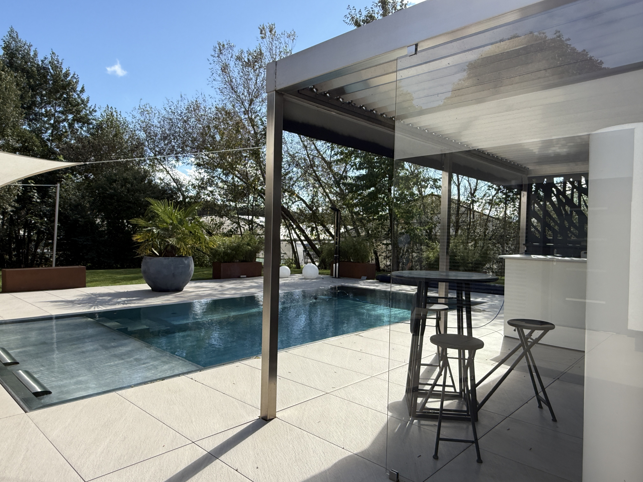 La conception moderne de ce bien se retrouve également dans le jardin paysagé, agrémenté d’une piscine miroir à débordement de 8×4m en INOX avec un escalier immergé et une plage de 1m50/4m, sécurisée et chauffée, une pergola inoxydable avec bar ainsi qu’une belle allée de 60m éclairée et pavée avec la possibilité de plusieurs stationnements.