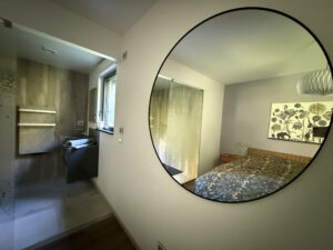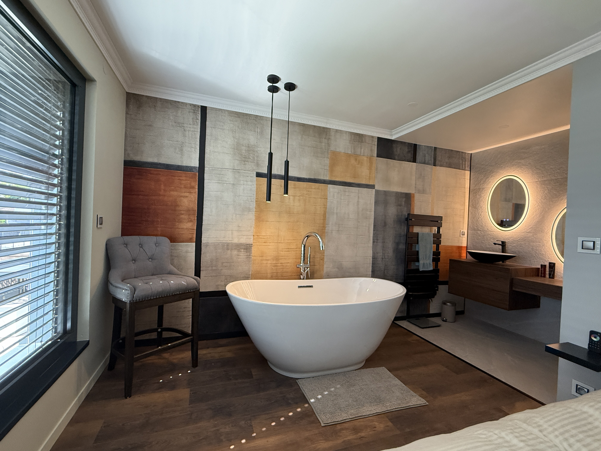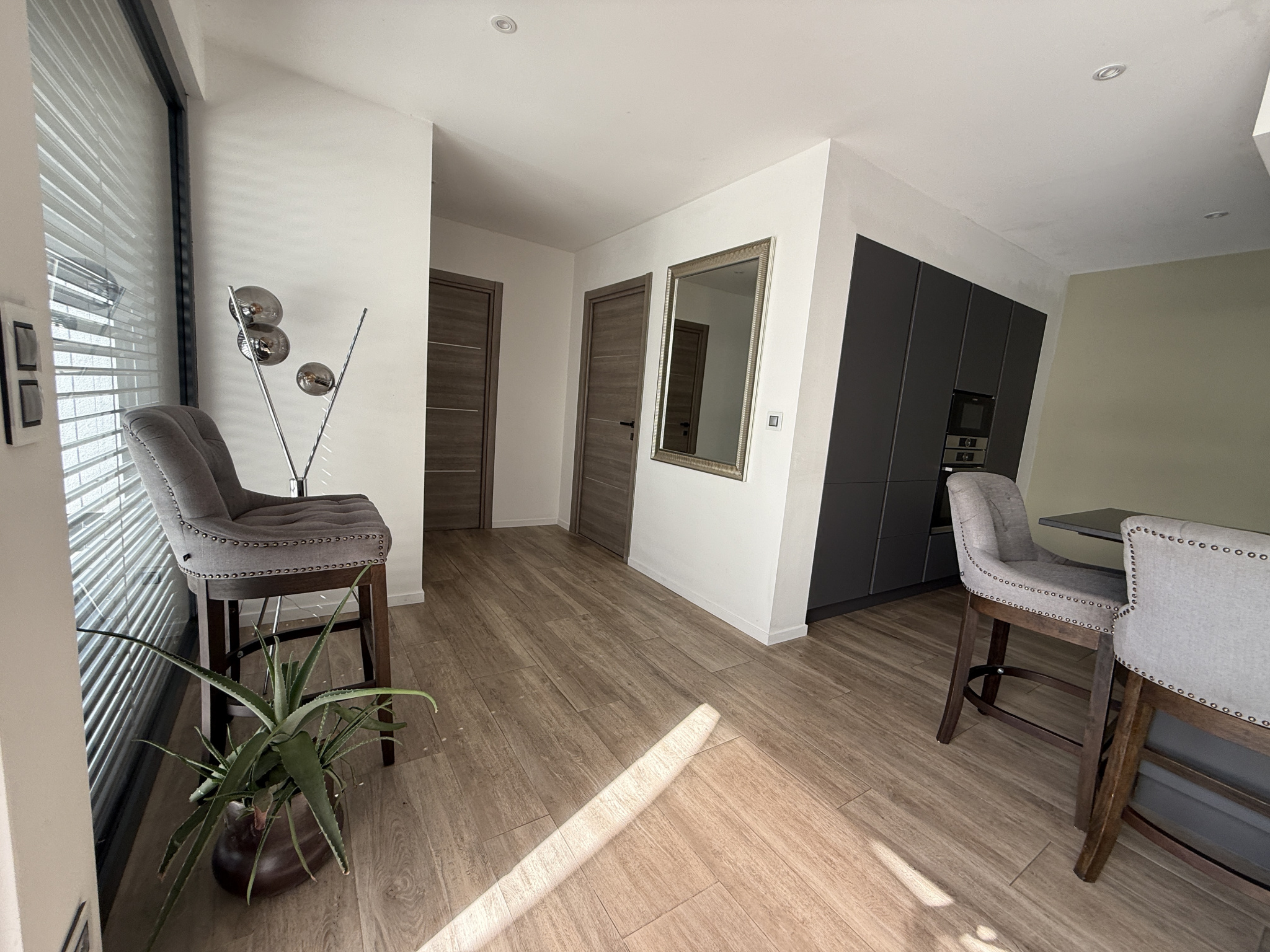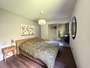 Un escalier suspendu acier au design raffiné, associé à un plancher en verre sécurit, mène à l’étage où vous découvrirez deux chambres lumineuses et confortables ainsi qu’une salle d’eau agréable. La suite parentale offre une salle de bain haut de gamme avec douche à l’italienne et sa baignoire îlot, alliant modernité et raffinement.