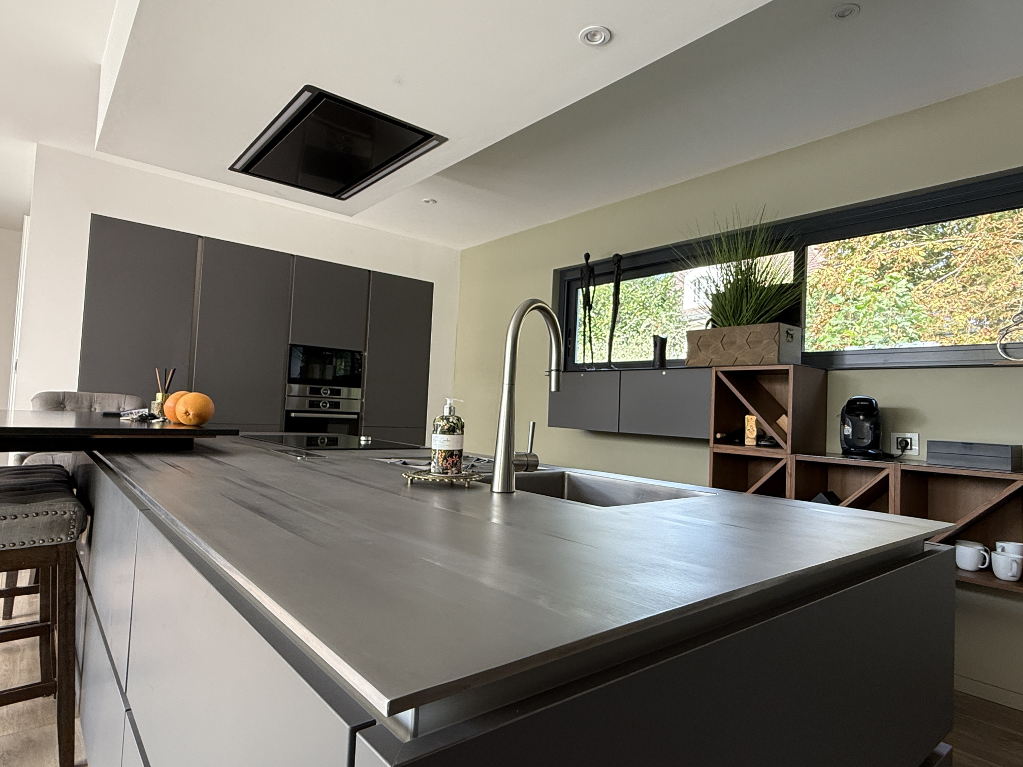 Au rez-de-chaussée, le hall d’entrée donne accès à une pièce de vie de près de 50 m2 proposant des espaces comme le salon, la salle-à-manger et la cuisine ouverte très bien conçue et équipée avec plan de travail en inox massif