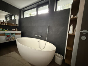 A l’étage : une suite parentale avec dressing et salle de bain, une seconde chambre ainsi qu’une salle de bain avec baignoire ilot.