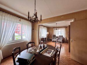 Elle se compose au RDC d’une entrée, un double séjour, d’une cuisine, d’une salle de bain avec wc