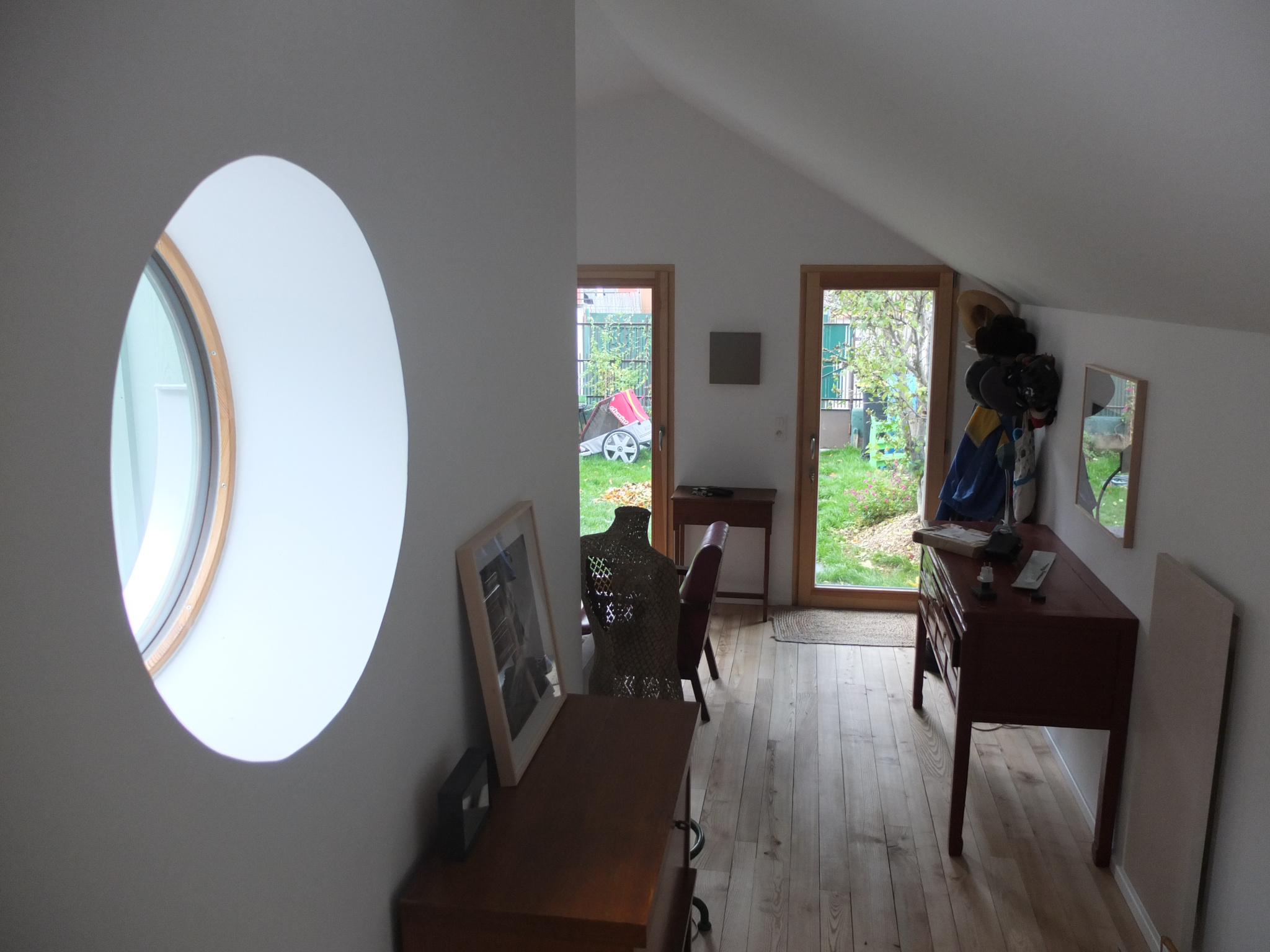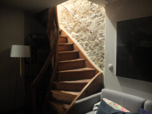Triple vitrage, matériaux naturels (parquet frêne-olivier, liège isolant, pierre apparente)