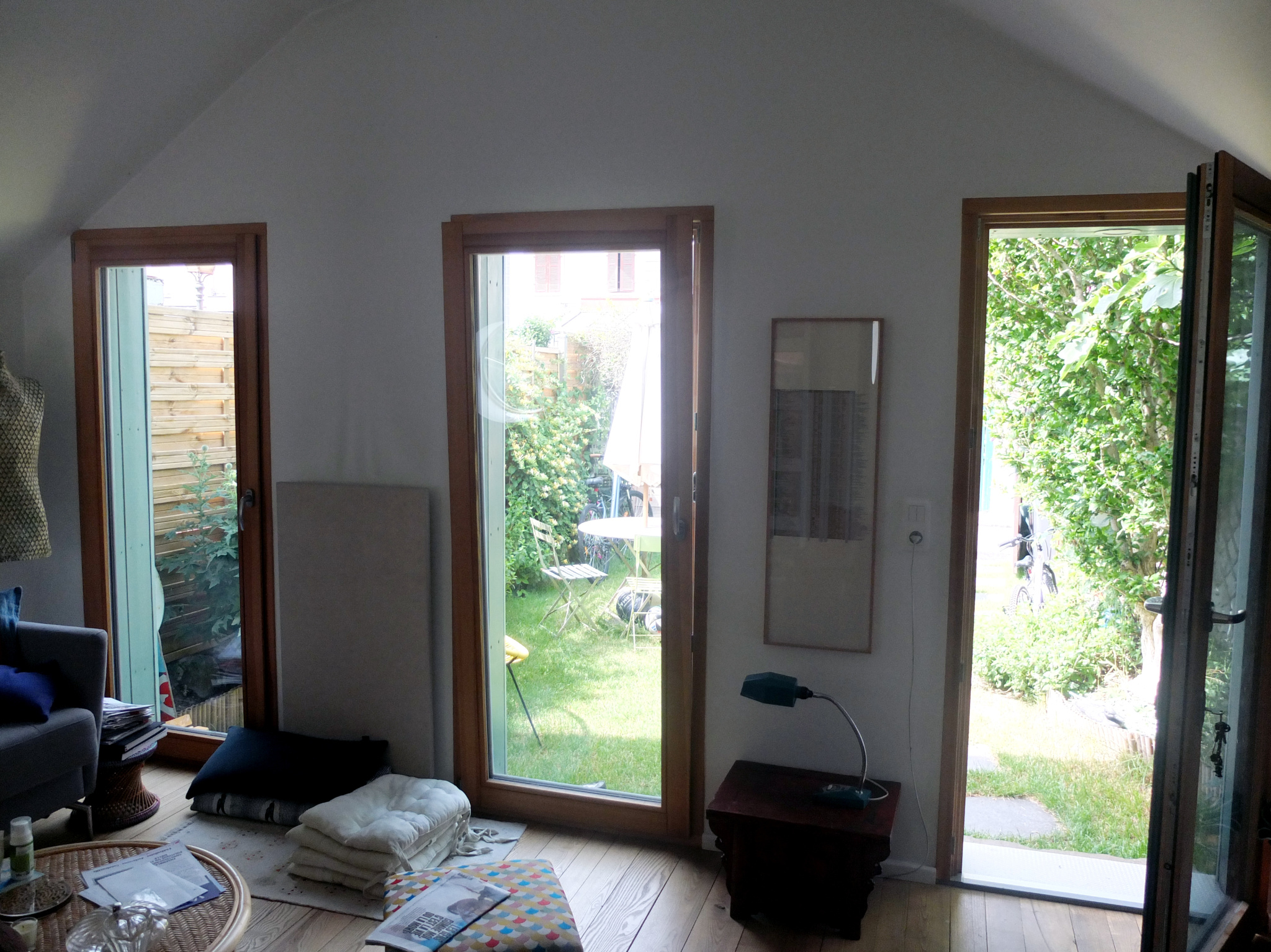 Salon / salle à manger avec baies vitrées triple vitrage ouvertes sur le jardin arboré (althéa centenaire, olivier)