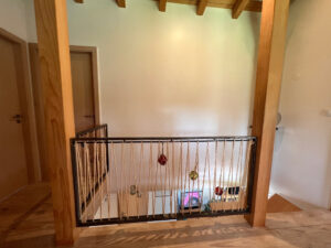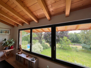 au rdc d’une entrée avec penderie, d’un espace cuisine aménagée et équipée (marque WANNER) ouverte sur un espace à vivre avec un plusieurs accès sur une terrasse en bois (mélèze) d’environ 30m2 exposée sud/est, nombreuses baies vitrée équipées de BSO (brise soleil orientable) avec une vue imprenable sans aucun vis à vis, d’un espace bureau de 10m2, d’un toilette suspendu avec lave main