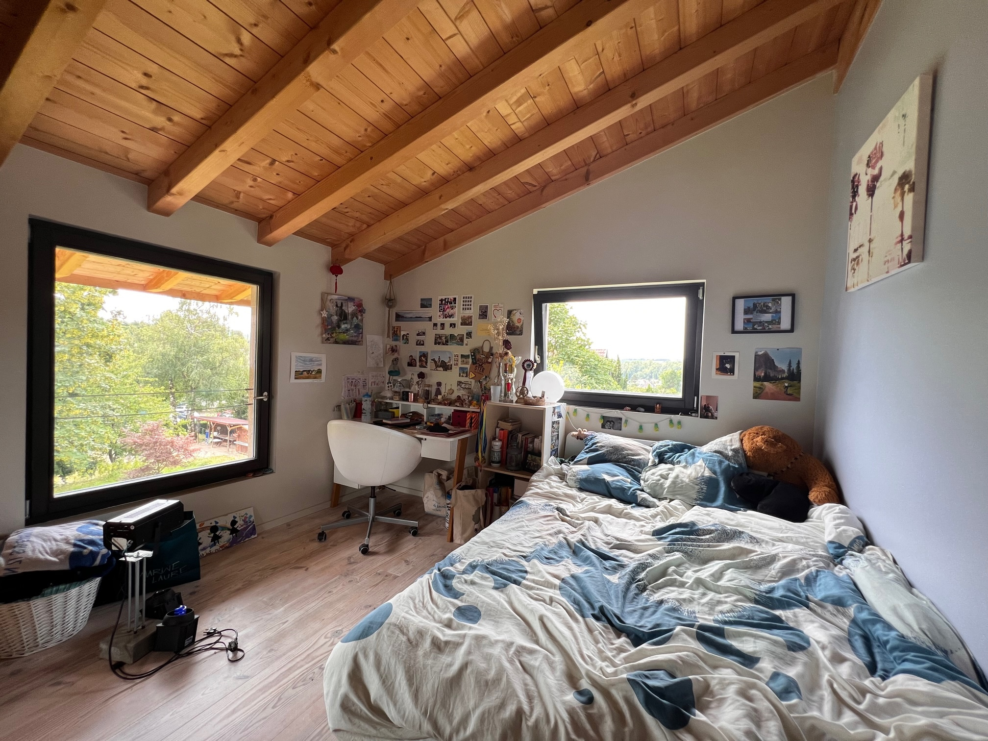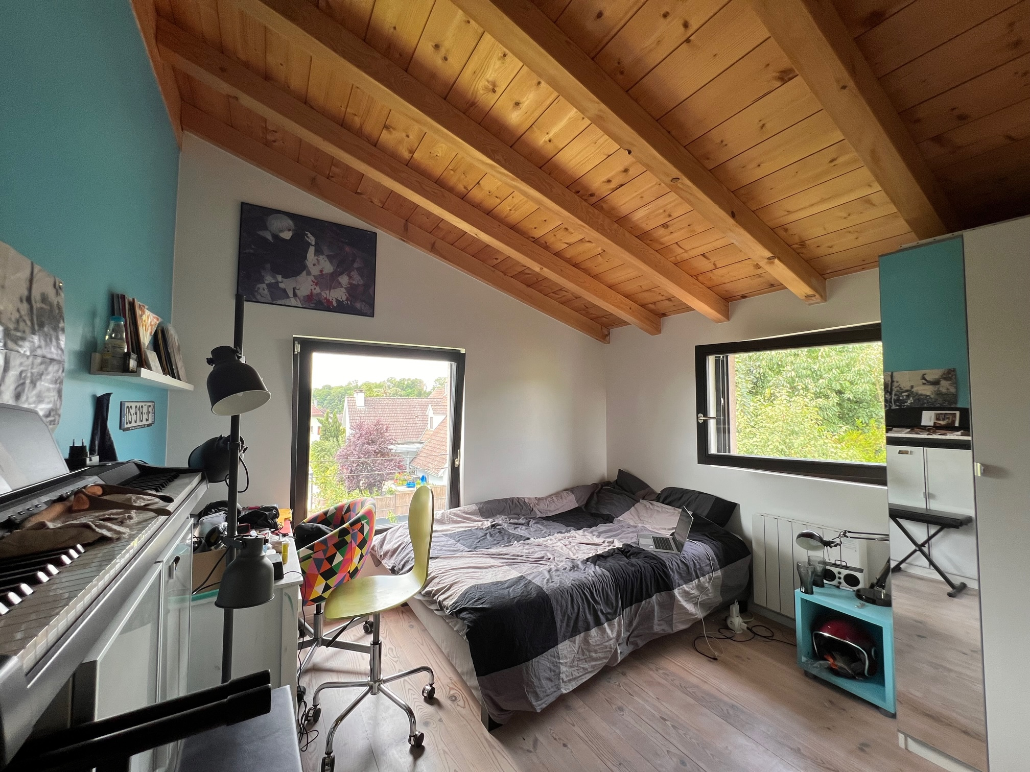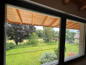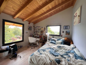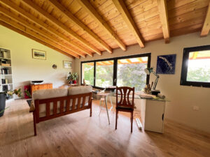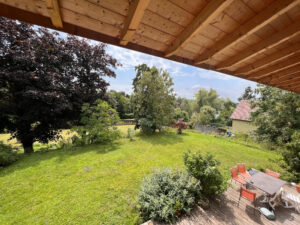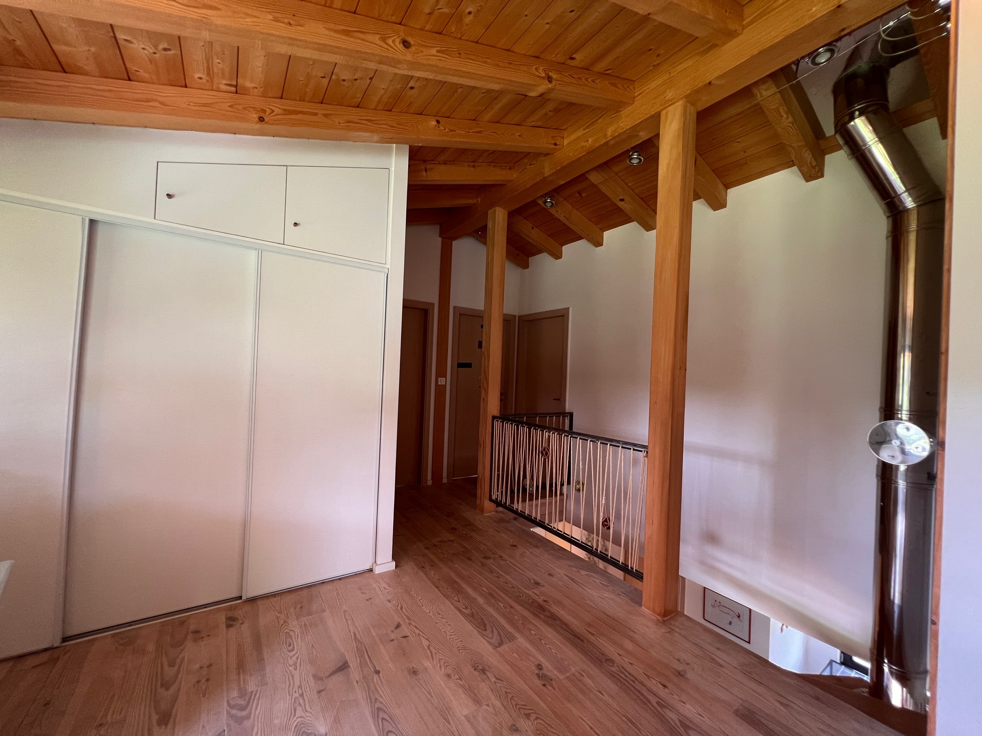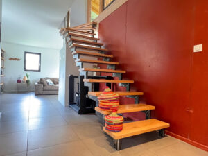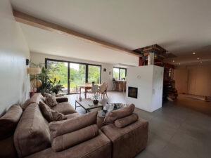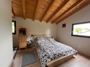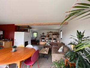 La maison est équipée d’une VMC hydroréglable, d’un poêle de masse, de double vitrage en bois avec BSO, terrasse en mélèze, escalier bois,