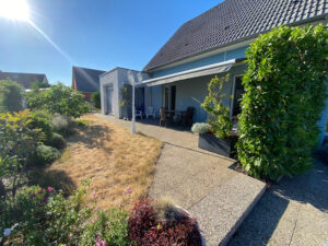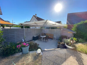 A l’extérieur : Un agréable jardin clos et arboré avec 2 terrasses, maison de jardin, une place de parking extérieur, portail extérieur automatique
