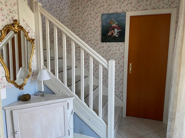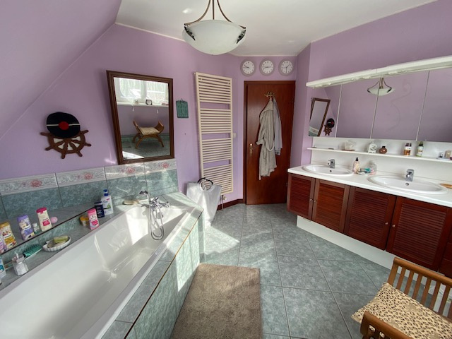 A l’étage : 3 belles chambres avec placards muraux, une vaste salle de bain avec baignoire, double vasque et toilette