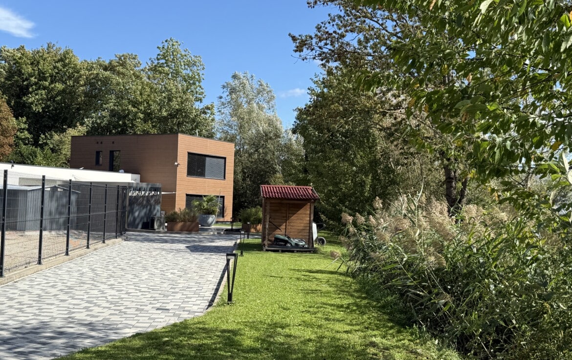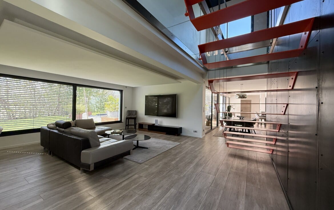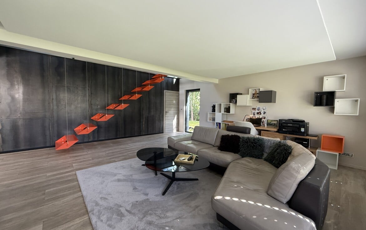 Le confort de la maison est assuré par un poêle à pellets, ballon thermodynamique, des BSO, des menuiseries en aluminium haut de gamme Paralu Lyon sans seuils, un escalier en acier design et un plancher de verre, un réseau Starlink, un portail automatisé avec digicode et caméra et bien d’autres prestations haut-de-gamme associées à des finitions de qualité