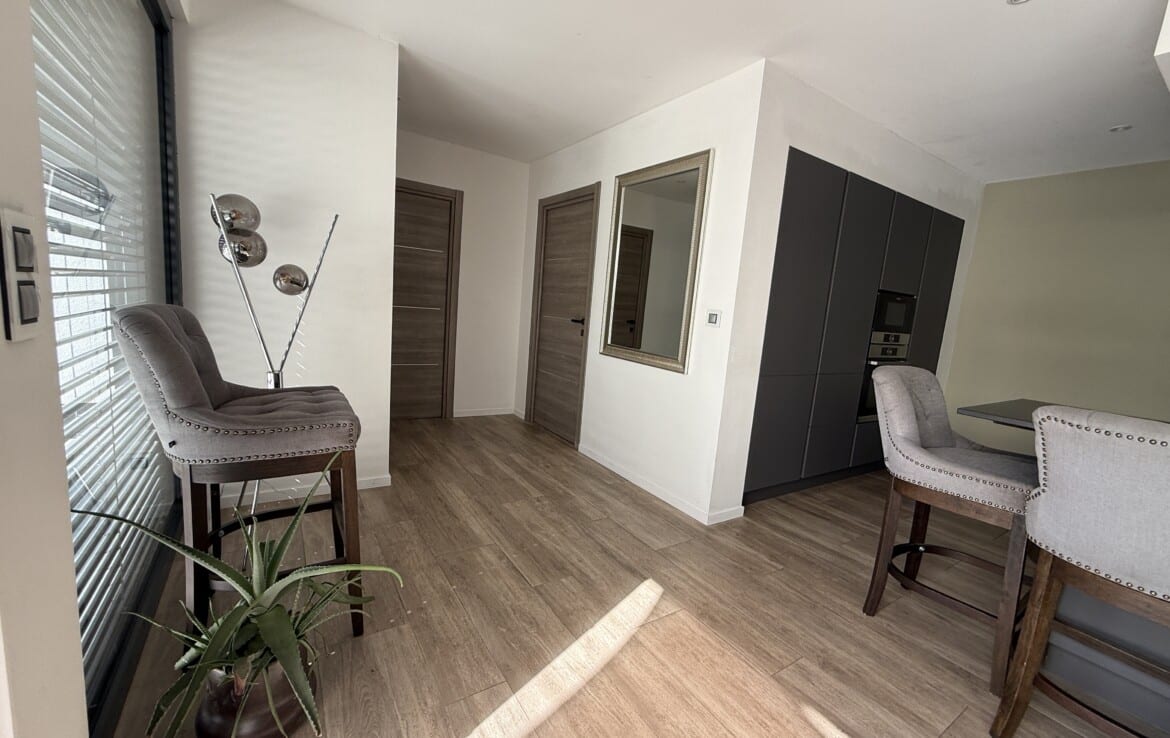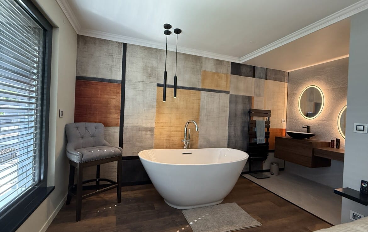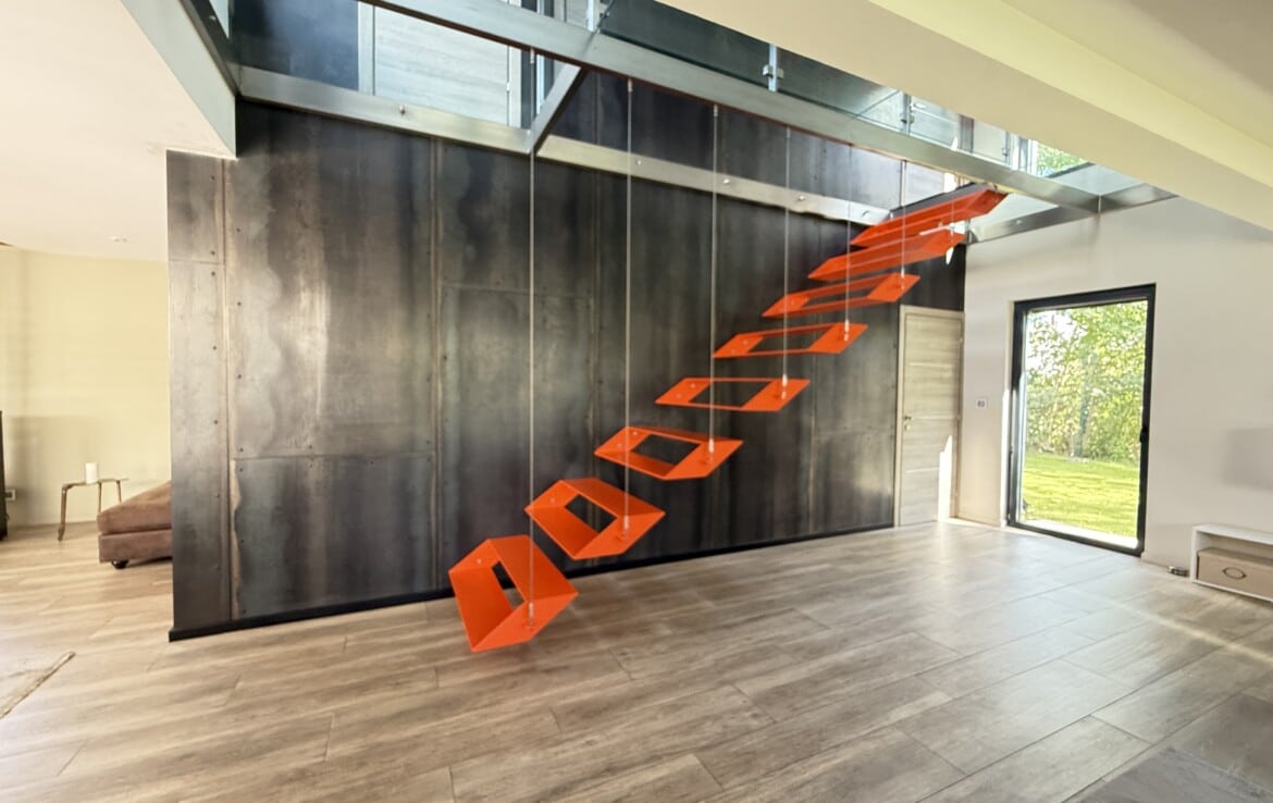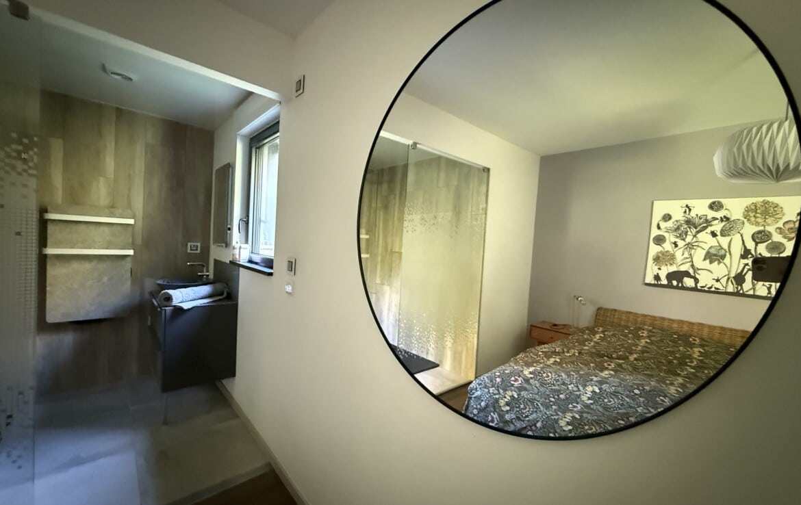 Un escalier suspendu acier au design raffiné, associé à un plancher en verre sécurit, mène à l’étage où vous découvrirez deux chambres lumineuses et confortables ainsi qu’une salle d’eau agréable. La suite parentale offre une salle de bain haut de gamme avec douche à l’italienne et sa baignoire îlot, alliant modernité et raffinement.